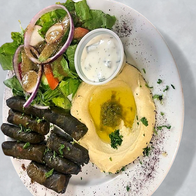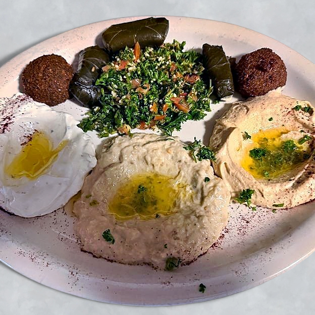 Hummus, baba ganuj, grape leaves, tabouli and falafel.