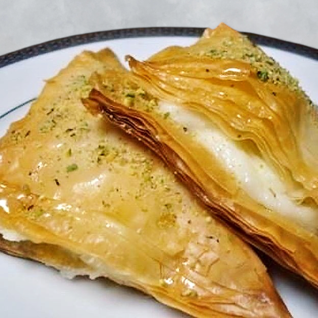 Phyllo dough stuffed with milk custard topped with honey.