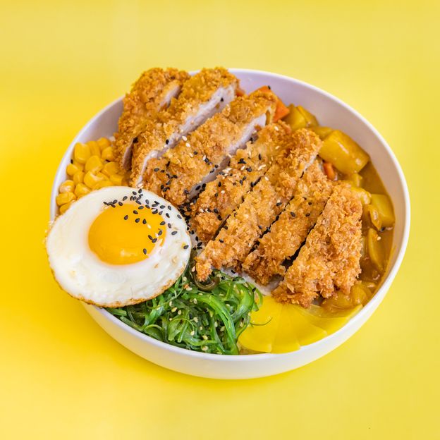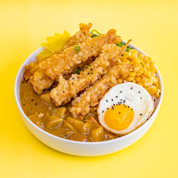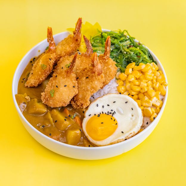 What's inside: White rice, japanese curry, butterfly shrimp, corn, romaine lettuce, yellow raddish, sesame & fried egg!