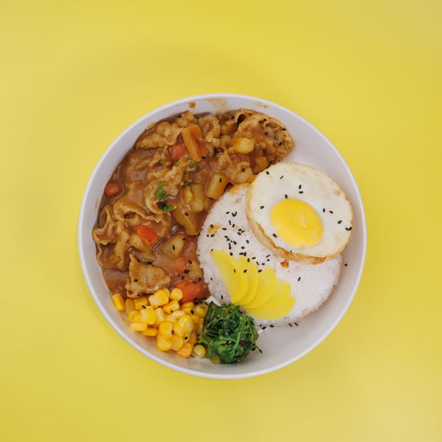 What's inside: White rice, Japanese curry, chicken cutlet, corn, romaine lettuce, yellow raddish, sesame & fried egg!