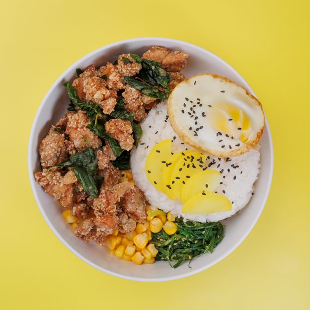 What's inside: White rice, popcorn chicken, basil, corn, romaine lettuce, yellow raddish, sesame & fried egg!