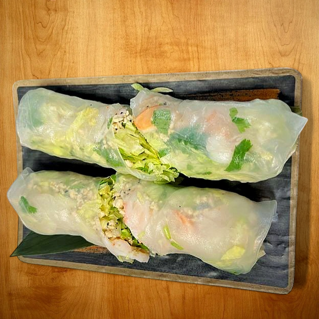 Soft rice paper wrapped with fresh cilantro, lettuce, carrot, mint, shrimp, chicken and rice noodle. Served with peanut sauce.
