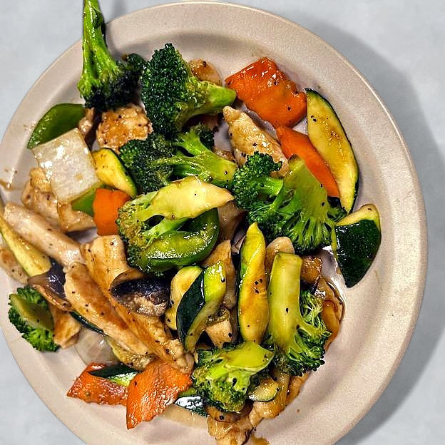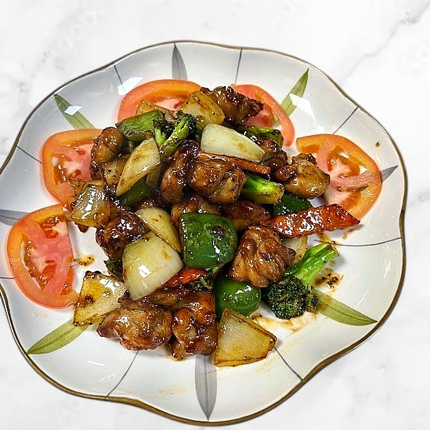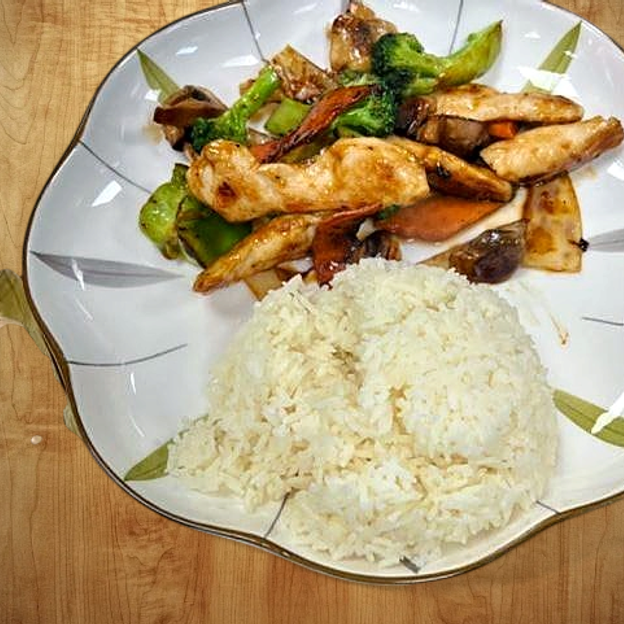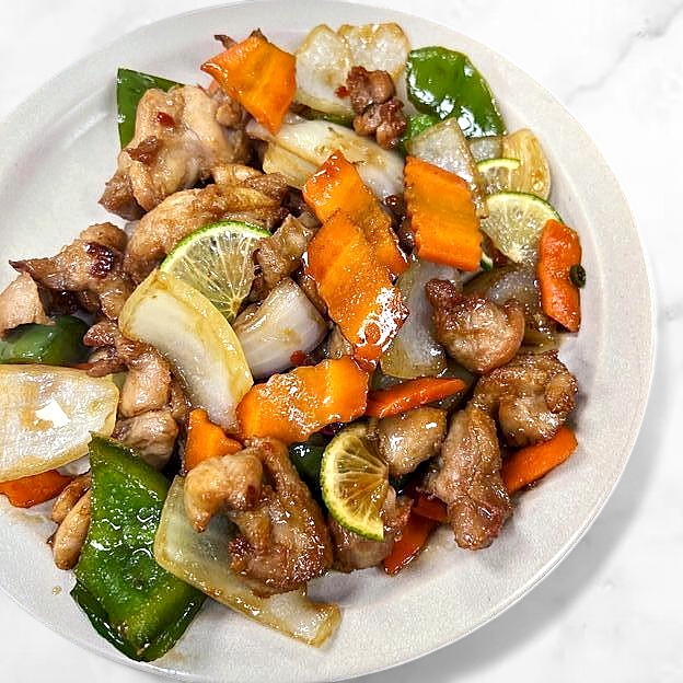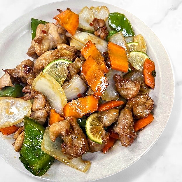 Bell peppers, onions, fried noodles and ground chicken stir fried with thai hoisin sauce. Served with lettuce cups.