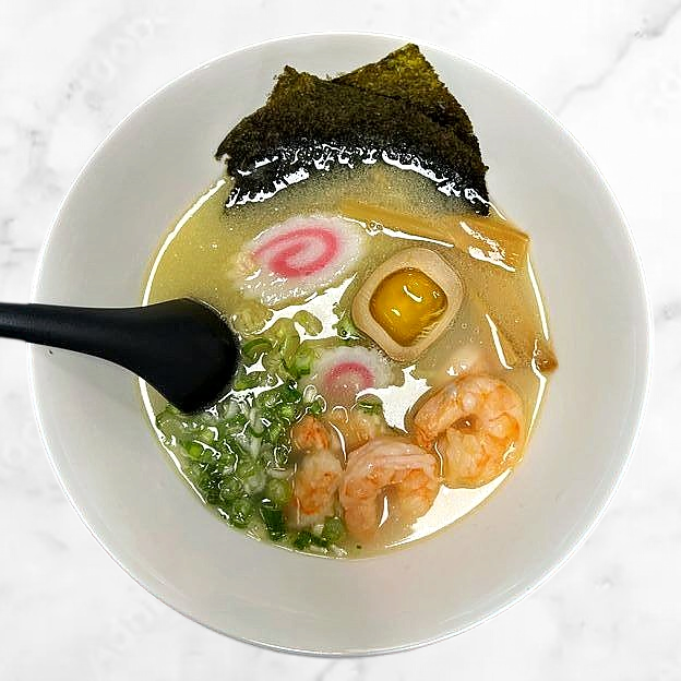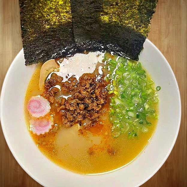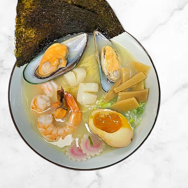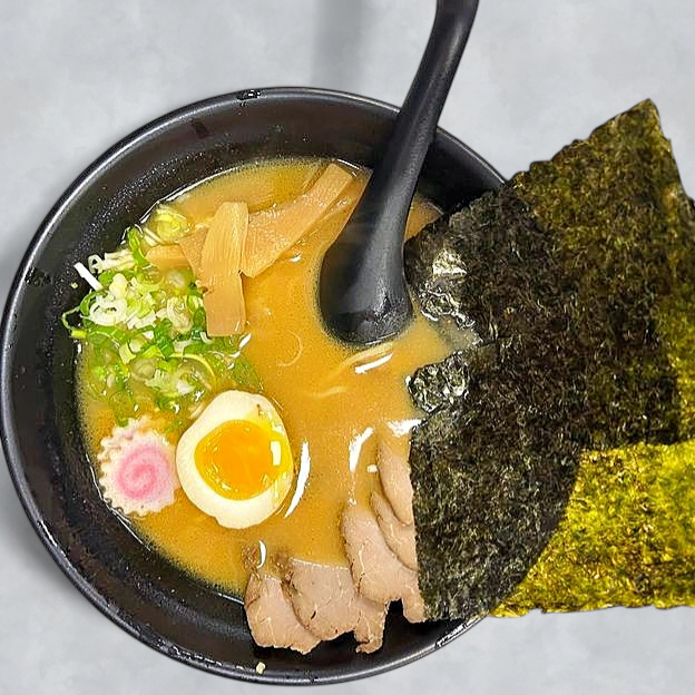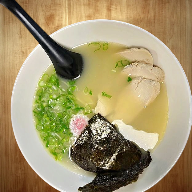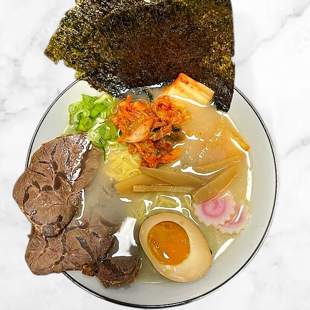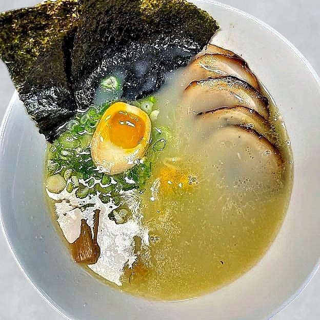 Pork broth pork chasu with bamboo shoot, scallion, nori, seaweed, boiled half egg and fish cake.