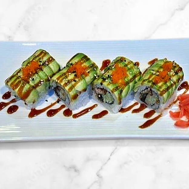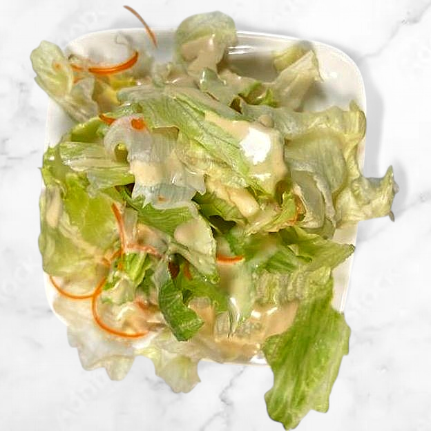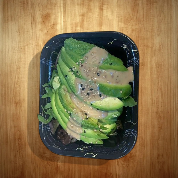 Fresh avocado slices with mixed greens and a sesame dressing.
