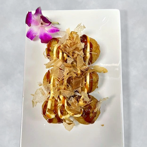 6pcs fried octopus ball with takoyaki sauce, mayo and bonito flakes.