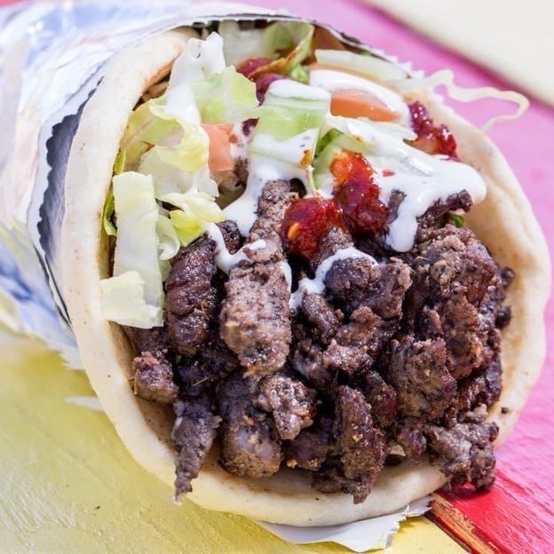 Beef marinated, thinly sliced with lettuce, cucumbers, and tomato wrapped in a pita bread.