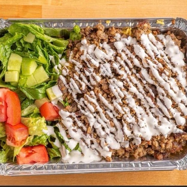 Tender lean lamb and beef meat grilled and chopped over spiced basmati rice and a side salad.
