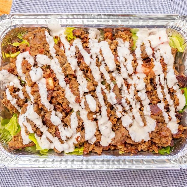 Romaine lettuce.tomatoes.cucumber over gyro&chicken meat and white sauce and hot sauce