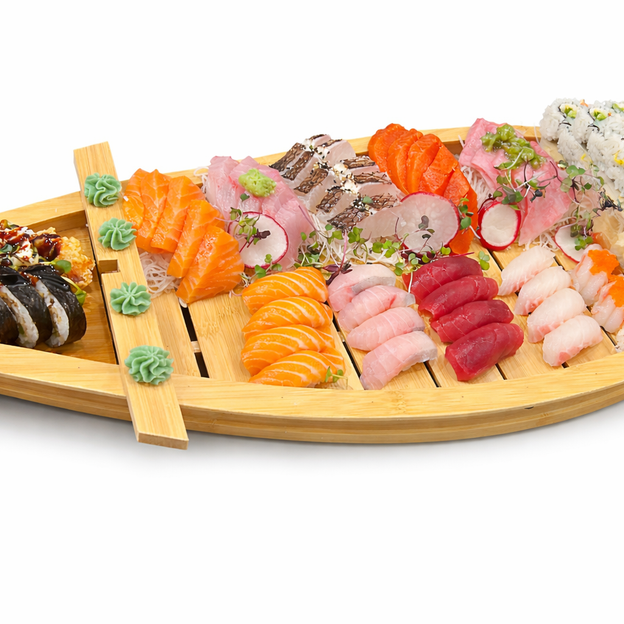 24 pcs sashimi, 10 pcs nigiri, 3 rolls (California, spicy tuna, tempura)