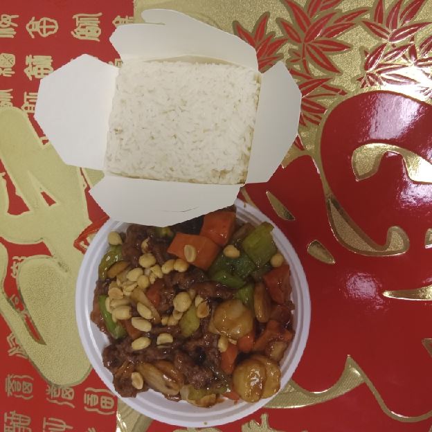 Jumbo shrimps with carrots celery green pepper waterchestnut in brown sauce and cashewnuts on the top
