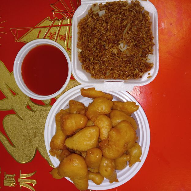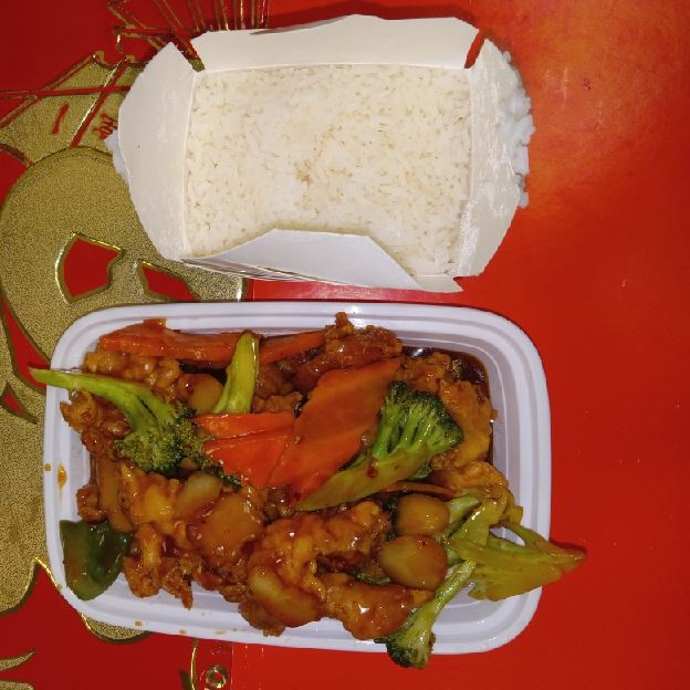 Battered Chunky chicken breast in orange flavor special sweet sour sauce ATTENTION:Chicken was harder,if you want it soft tell us .we can make it different way